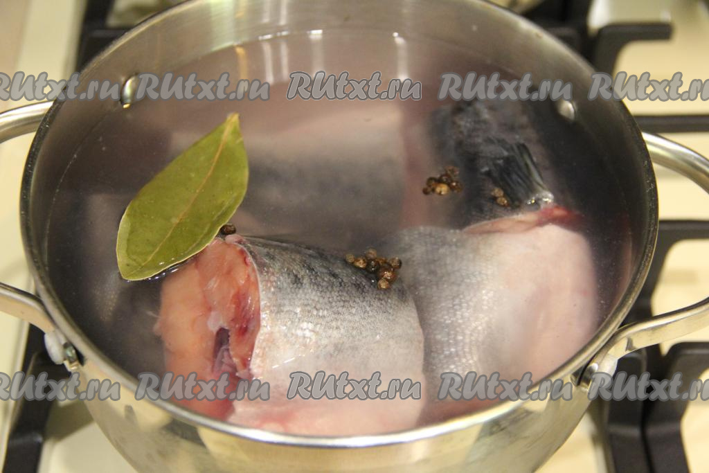 Полностью залить кусочки горбуши водой, по желанию, можно добавить перец горошком и лавровый лист. Поставить кастрюлю с рыбой на достаточно сильный огонь, довести до кипения.