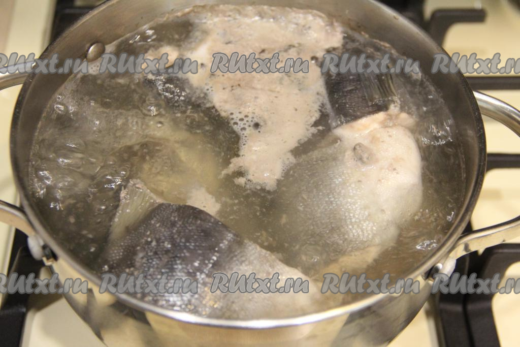 Когда рыбный бульон закипит, убавить огонь и снять пенку. Варить горбушу 15-20 минут.