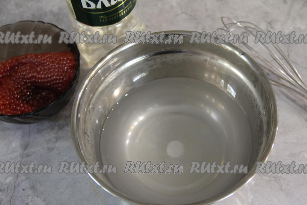Взять обычный венчик и начать перемешивать икру. Все икринки аккуратно отсоединятся от плёнки, а плёночка намотается на венчик. Плёночку выбросить, а икру оставить в солёной воде минут на 5, чтобы она просолилась.
