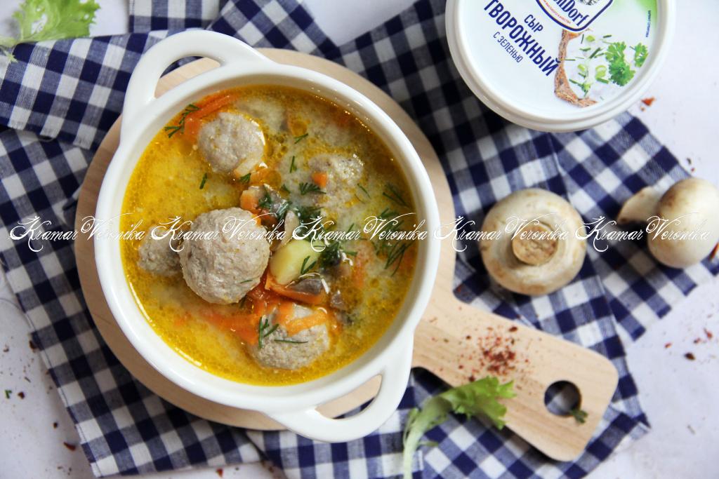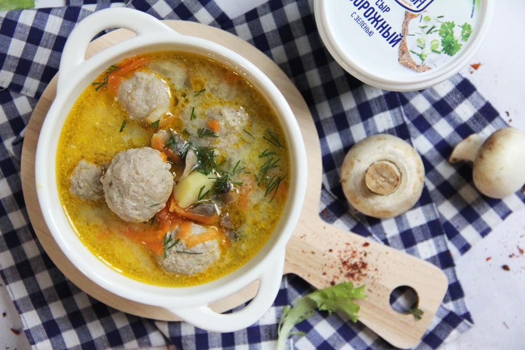 Предлагаю сварить к обеду насыщенный, очень вкусный сырный суп с шампиньонами и фрикадельками. Готовится это блюдо недолго, ведь не придётся тратить время на варку мясного бульона. Плавленный сыр использую в коробочках, так как не доверяю сыру типа "Дружба". Суп, приготовленный по этому простому рецепту, получается очень вкусным, с приятным грибным ароматом и нежной, бархатистой текстурой. Всем советую попробовать!