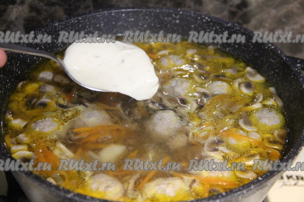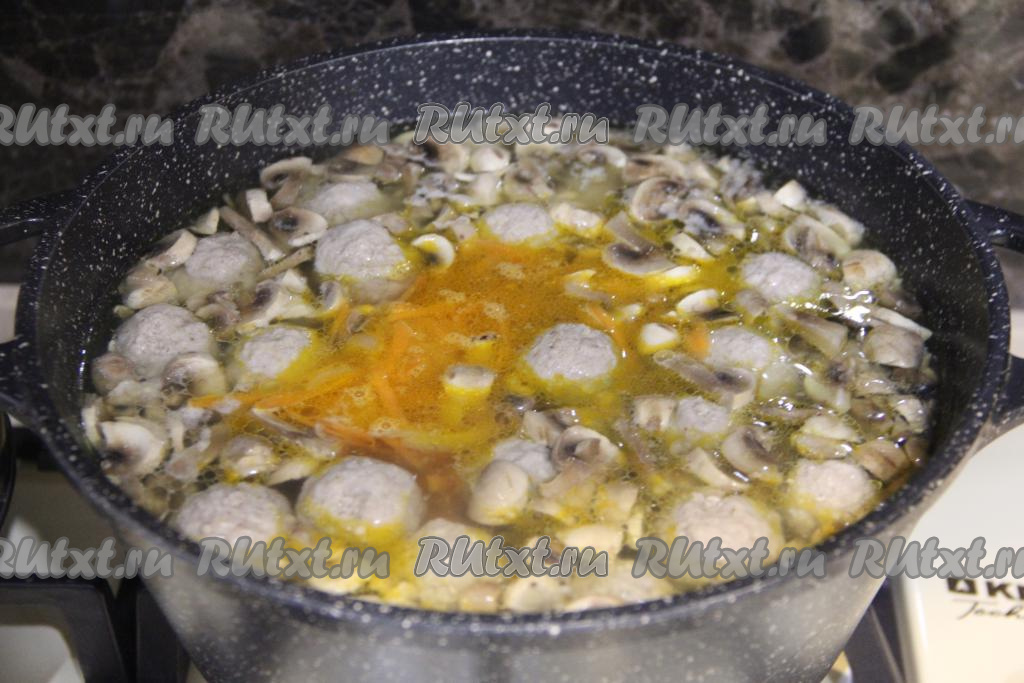 После того как картошка вместе с фрикадельками проварится 10 минут, добавить в суп нарезанные шампиньоны и обжаренные овощи, дать закипеть и варить на небольшом огне 10 минут.