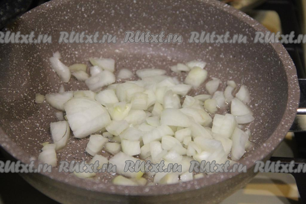 Лук и морковку почистить. Мелко нарезать лук и обжарить его на растительном масле на среднем огне в течение 5 минут (до прозрачности), иногда помешивая.