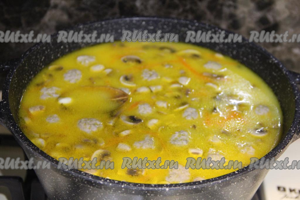 Томить суп 3-5 минут (до полного расплавления сыра). Снять с огня и дать настояться минут 10 под крышкой.