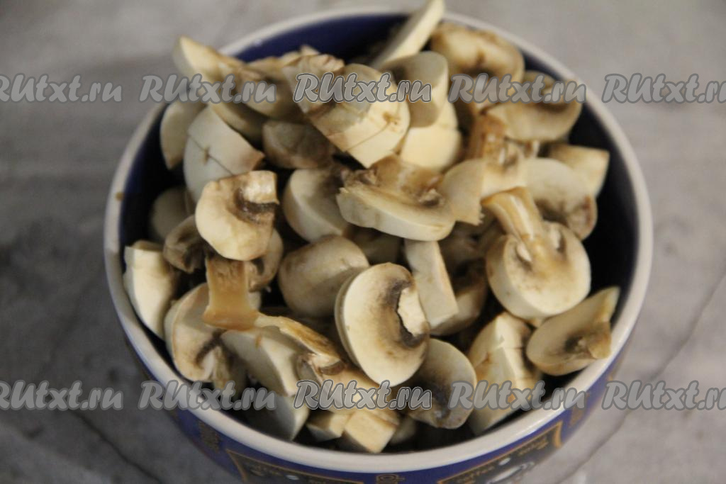 Шампиньоны промыть водой, нарезать на пластинки.