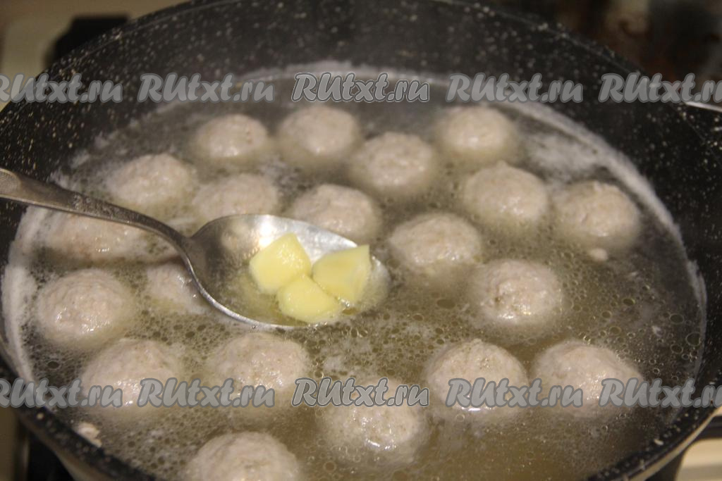 Картошку очистить. Как только вода в кастрюле с фрикадельками закипит, выложить картошины, нарезанные на средние кубики, дать закипеть, а после этого варить 10 минут на небольшом огне.