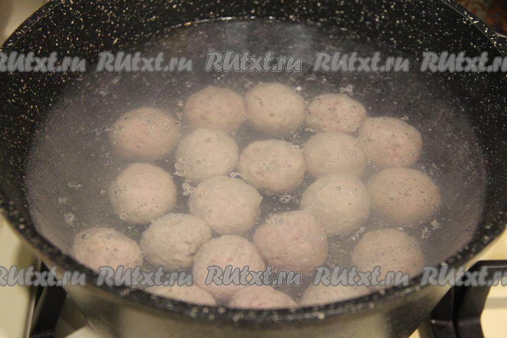 В кастрюлю влить 2 литра воды, поставить на сильный огонь. В закипевшую воду аккуратно выложить фрикадельки, снова дать воде закипеть.