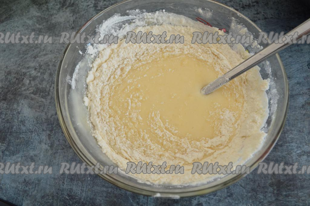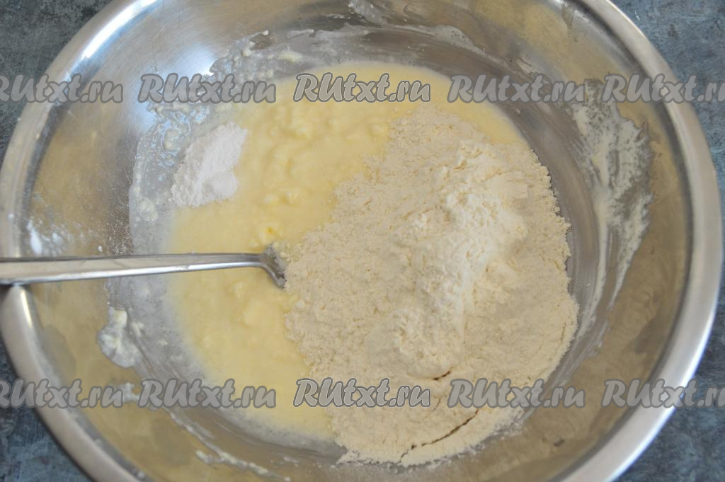 Перемешать массу вилкой до однородности. Всыпать разрыхлитель, снова перемешать.