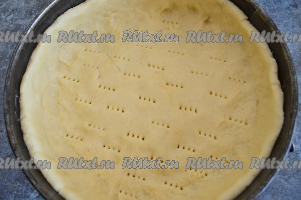По прошествии времени достать песочное тесто из холодильника. Дно и бока формы для выпечки (у меня разъёмная форма диаметром 22 сантиметра) смазать небольшим кусочком сливочного масла. Тесто равномерно распределить по дну форму, формируя бортики. По дну формы на тесте вилкой сделать проколы. Проколы нужны, чтобы песочное тесто сильно не поднималось во время выпечки в духовке.