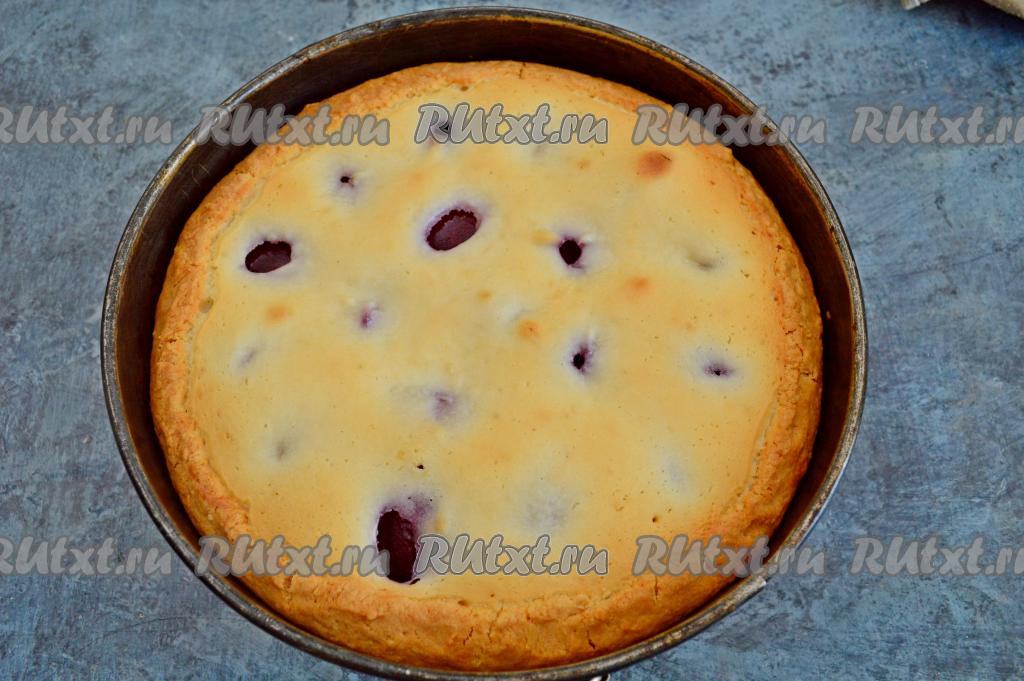 Пирог со сливами в сметанной заливке выпекать 50-55 минут в разогретой до 180 градусов духовке. Готовность пирога проверяйте по заливке. Если проткнуть готовую заливку сухой деревянной палочкой, то палочка по-прежнему останется сухой. Готовый пирог достать из духовки, дать ему немного остыть и снять бока формы.
