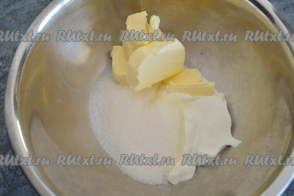 Вначале замесим тесто, для этого в глубокой миске нужно соединить сахар, сметану и сливочное масло комнатной температуры.
