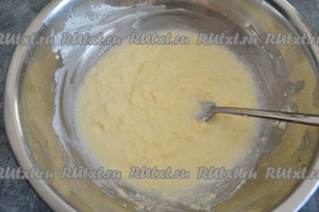 Перемешать и начать постепенно, по столовой ложке подсыпать в заливку муку, постоянно вмешивая порции муки в сметанную массу.
