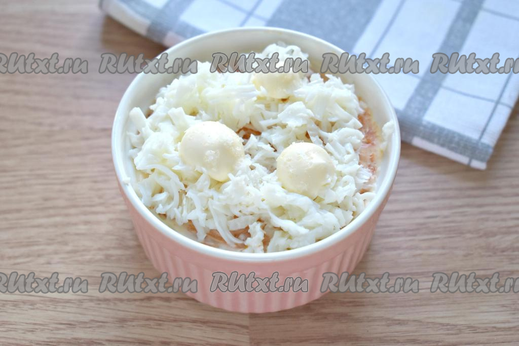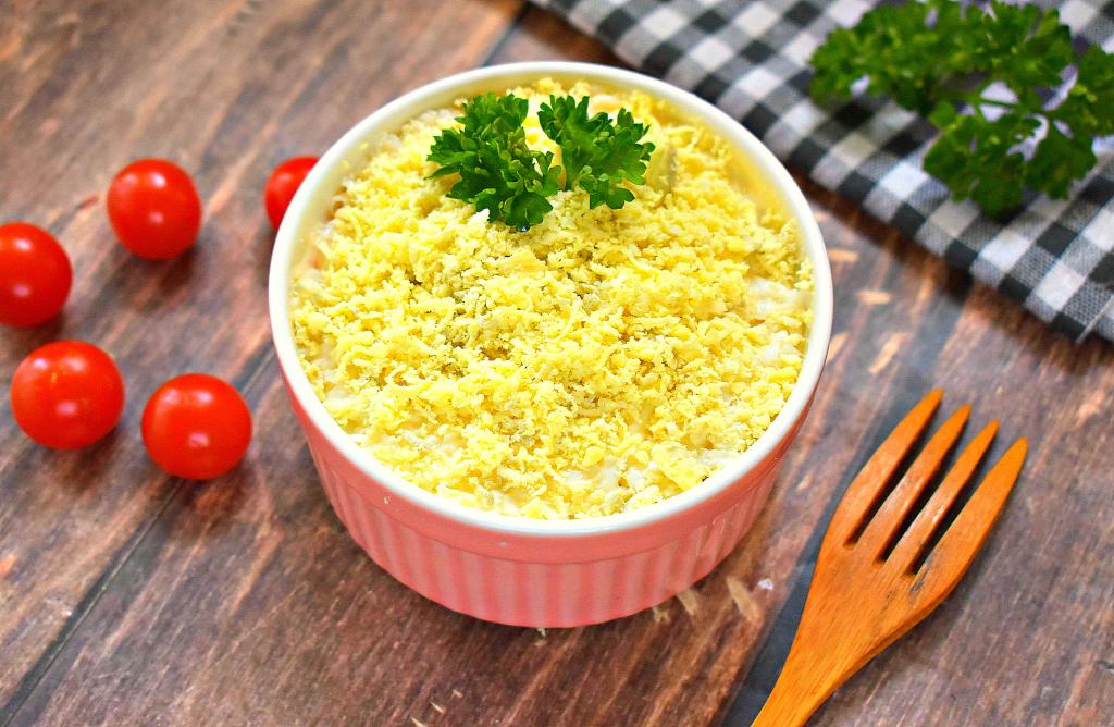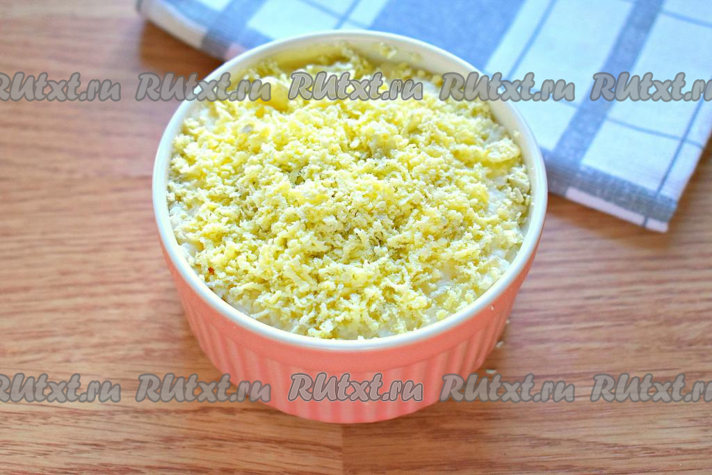 По традиции завершающим слоем салата "Мимоза" будут мелко натёртые желтки. Этот слой смазывать майонезом не нужно.