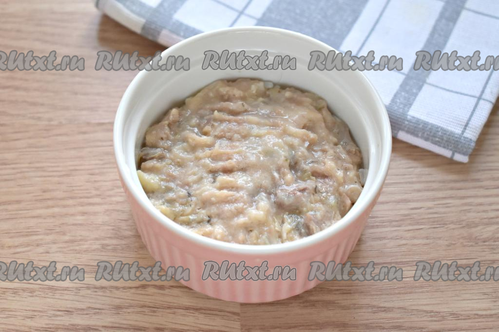 Рыбные консервы без масла перекладываем из банки сначала на тарелку, удаляем косточки, если они есть, разминаем вилкой. Размятую рыбку раскладываем ровным слоем поверх риса по двум креманкам.