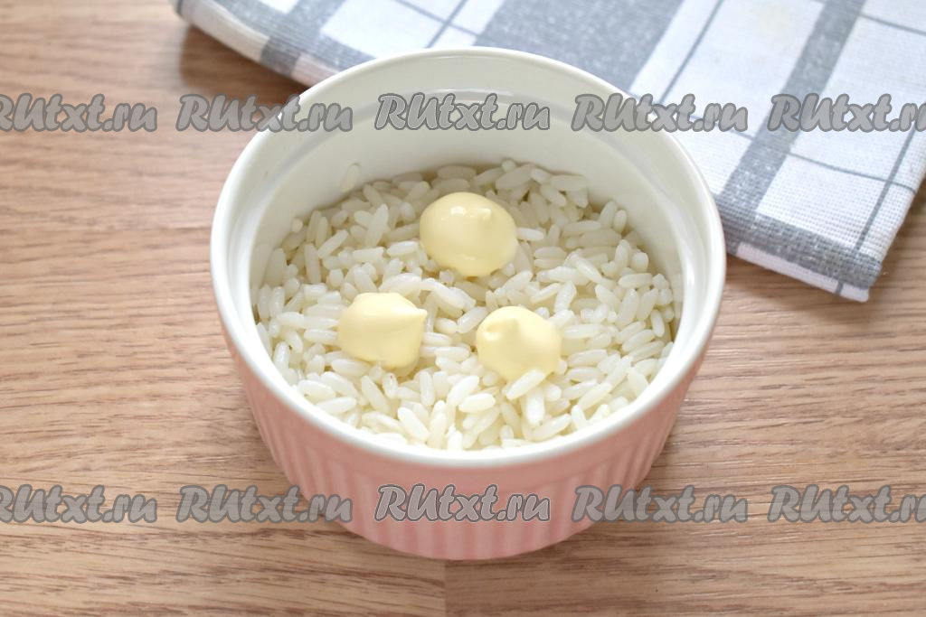 Рис промойте водой, выложите его в кастрюлю с достаточно большим количеством подсоленной кипящей воды, перемешайте, после закипания варите на небольшом огне до готовности (минут 15-20), затем откиньте рис на сито, ополосните холодной водой и оставьте, чтобы стекла лишняя жидкость. Также для салата следует заранее сварить вкрутую яйца (варим 10 минут с момента закипания воды). Отдельно нужно отварить, не очищая от кожуры, морковь (на варку уйдёт минут 30-35, готовая морковка будет легко прокалываться вилкой). Варёным морковке и яйцам дать остыть, а затем очистить. Когда все ингредиенты будут подготовлены, можно приступать к выкладыванию "Мимозы" слоями. Я формировала салат в 2 креманках, равномерно распределяя ингредиенты. Первым слоем выкладываем варёный рис, смазываем слой майонезом.