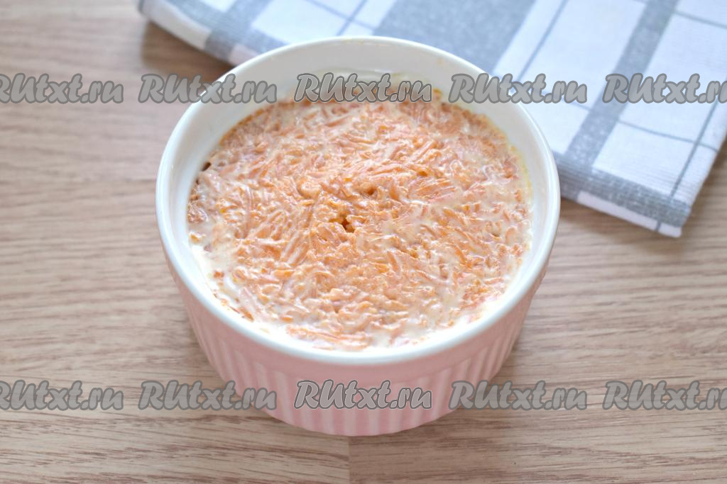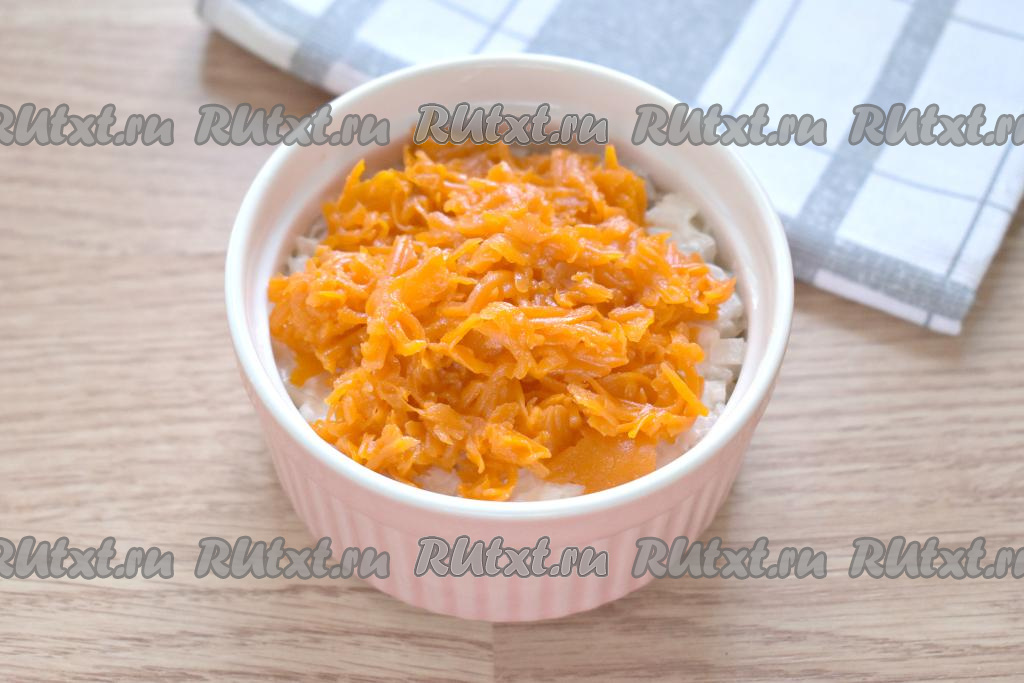 На мелкой тёрке натираем морковку и выкладываем её следующим слоем.