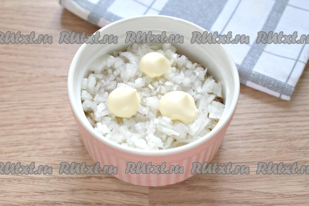 Очищенную луковицу нарезаем мелко, равномерно выкладываем на слой рыбы, смазываем майонезом.