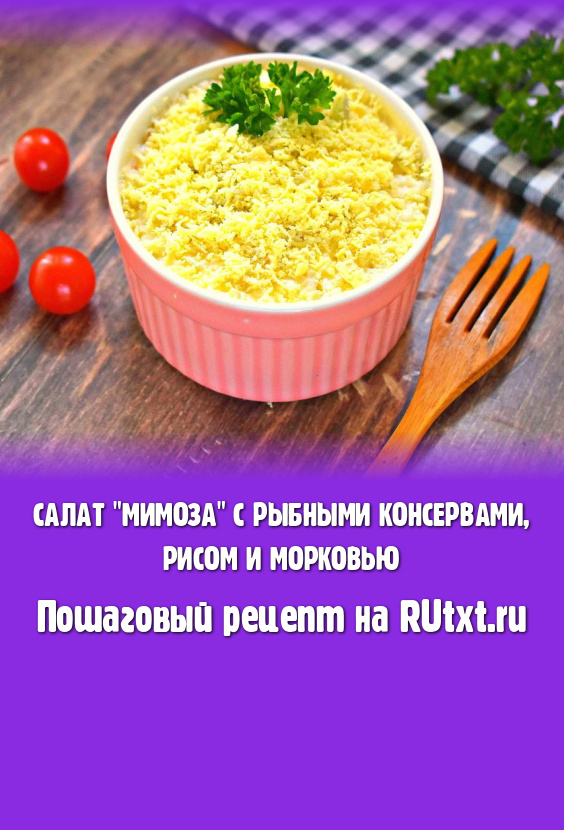 "Мимоза" - один из самых популярных салатов, который готовят и в будни, и в праздники. Вариантов этого салата очень много. Предлагаю рецепт "Мимозы", которая готовится с рыбными консервами, рисом и морковью без добавления картошки. Салат получается очень аппетитным, достаточно лёгким и вкусным. Я формировала салат порционно в 2 креманках, но можно делать и в одном салатнике. Уверена, такой вариант "Мимозы" найдёт своих почитателей!