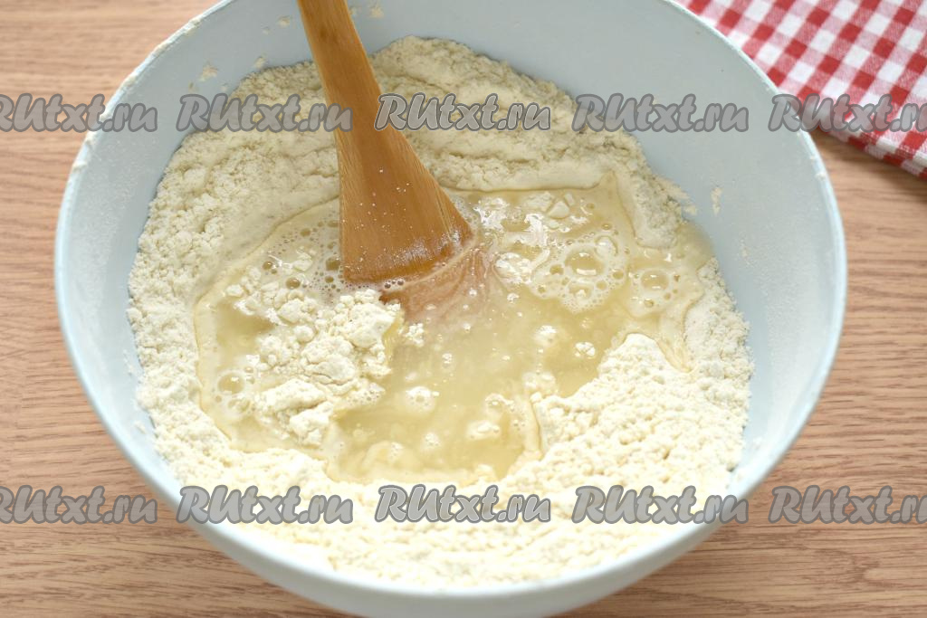 В получившуюся воронку вливаем тёплую воду (температура воды примерно 38-39 градусов) и оливковое (или подсолнечное) масло.