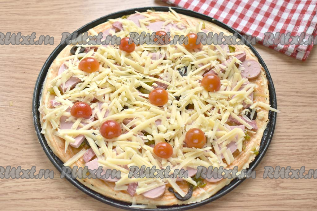 Сыр натираем на крупной тёрке. Сверху начинку присыпаем половиной натёртого сыра, выкладываем 4-5 разрезанных пополам помидоров черри (или 1 помидор среднего размера, нарезанный на кружочки). Аналогично формируем вторую пиццу с солёными огурцами, колбасой и сыром.