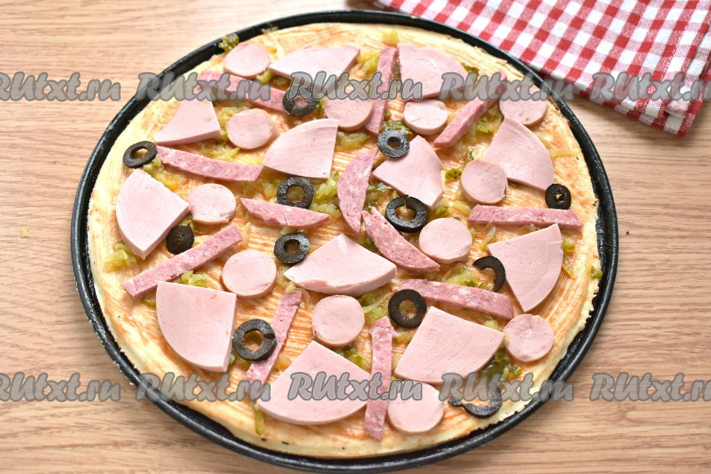 Для начинки можно взять один или несколько видов колбасы. Я взяла 80 грамм варёной колбасы, 70 грамм копчёной колбасы и 2 сосиски. Нарезаем колбасу (у меня - колбаса и сосиски) на средние кусочки любой формы. Маслины, если будете использовать, нарезаем на кружочки. Поверх основы для первой пиццы выкладываем половину нарезанных колбасы и маслин.