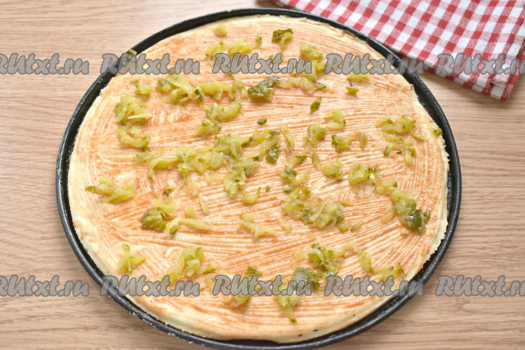 Огурец натираем на крупной тёрке. Выкладываем на основу для первой пиццы половину натёртого огурца.