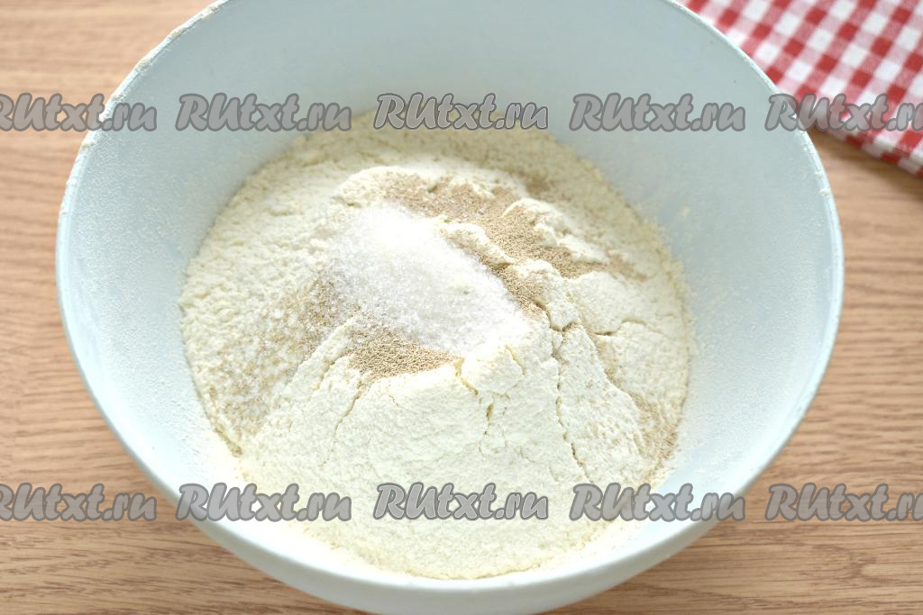 Прежде всего замесим дрожжевое тесто для пиццы, для этого просеиваем в широкую миску пшеничную муку, сразу же всыпаем сахар, соль и сухие быстродействующие дрожжи, очень хорошо перемешиваем, образуя в центре воронку.