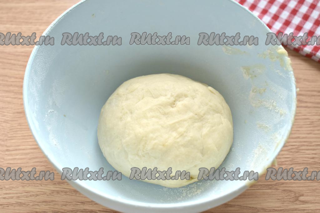 Перемешиваем содержимое миски сначала ложкой, собирая в комок, а затем тщательно вымешиваем тесто руками. Дрожжевое тесто должно получиться мягким и не прилипать к ладоням. Затягиваем миску с тестом пищевой плёнкой (или накрываем полотенцем) и ставим в тёплое место для подъёма на 1 час. За это время тесто увеличится в объёме раза в 2.
