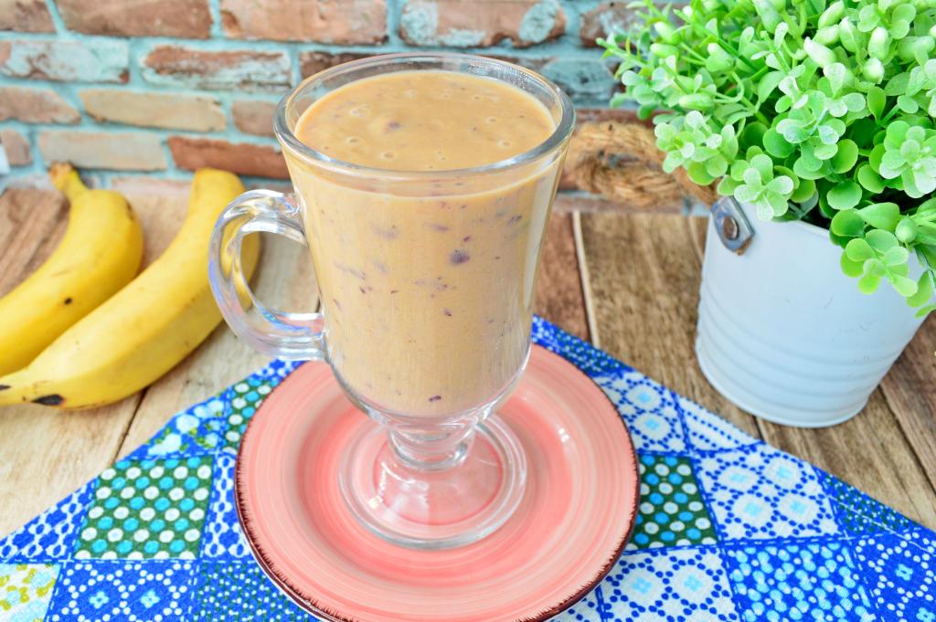 Вкусный, в меру густой смузи, приготовленный из банана и слив, сразу разлить по чашкам и начать наслаждаться полезным напитком. У меня всего получилось 400 миллилитров смузи.