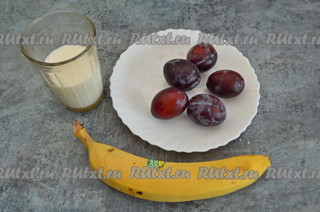 Подготовить продукты. Для смузи можно взять кефир или молоко любой жирности. Я взяла кефир жирностью 3,2%. Бананы и сливы лучше брать спелые, тогда сахар или мёд в напиток можно не добавлять.