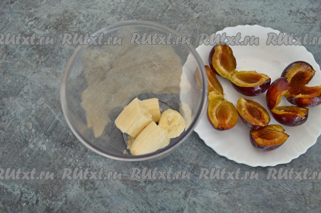 Банан очистить от кожуры. Сливы отделить от косточек. Банан, разломанный на кусочки, сложить в чашу погружного блендера.