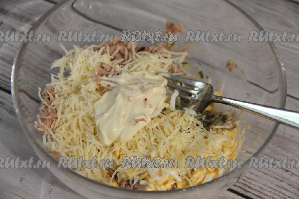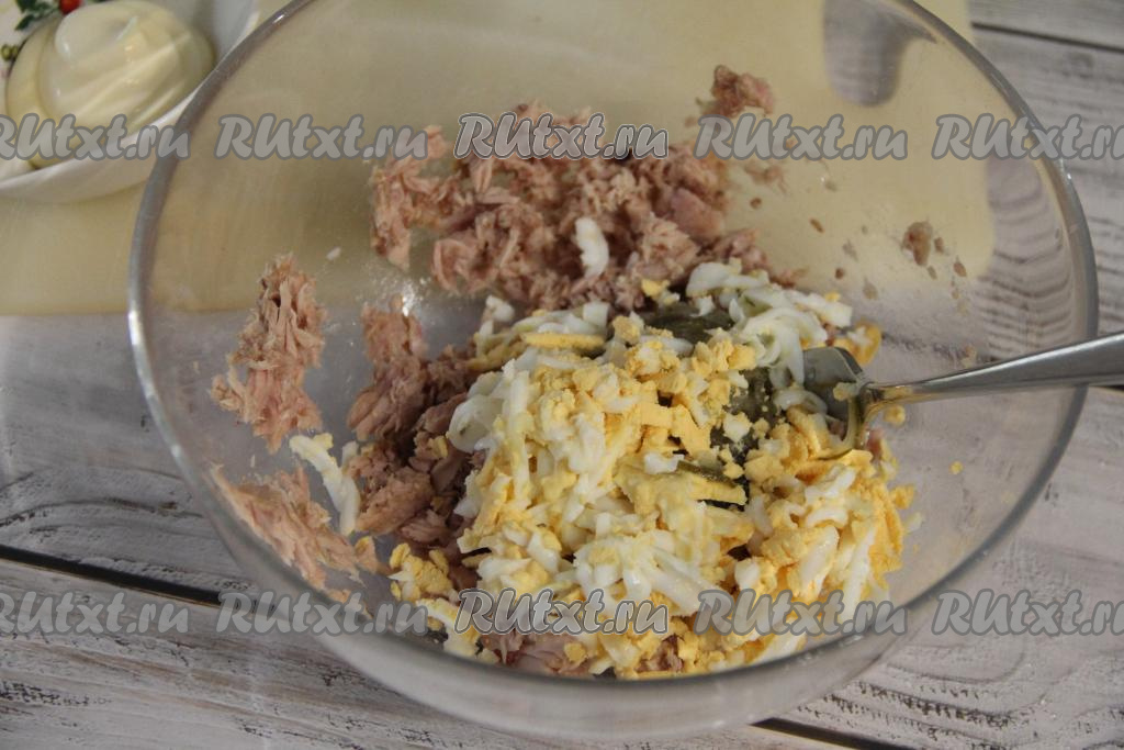 Сюда же выложить очищенное яйцо, натёртое на крупной тёрке.