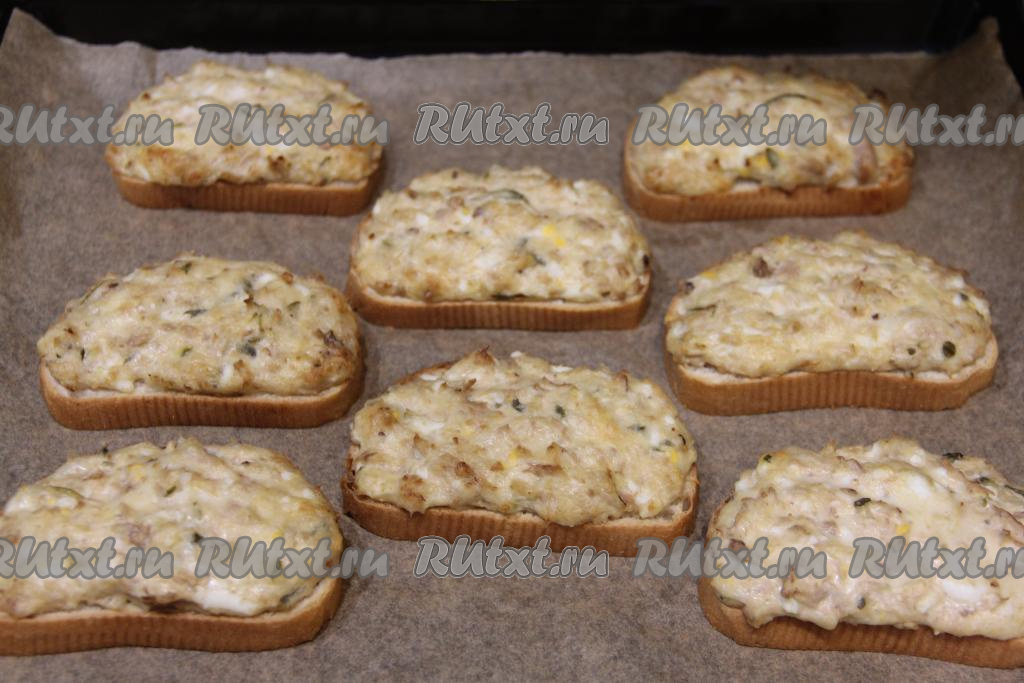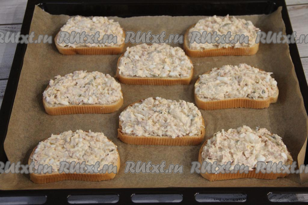 Выложить ломтики батона на противень, застеленный пергаментом для выпечки. Равномерно разложить рыбно-сырную массу поверх хлеба.