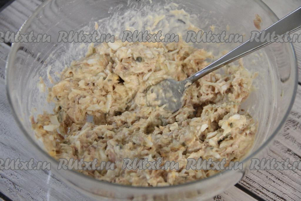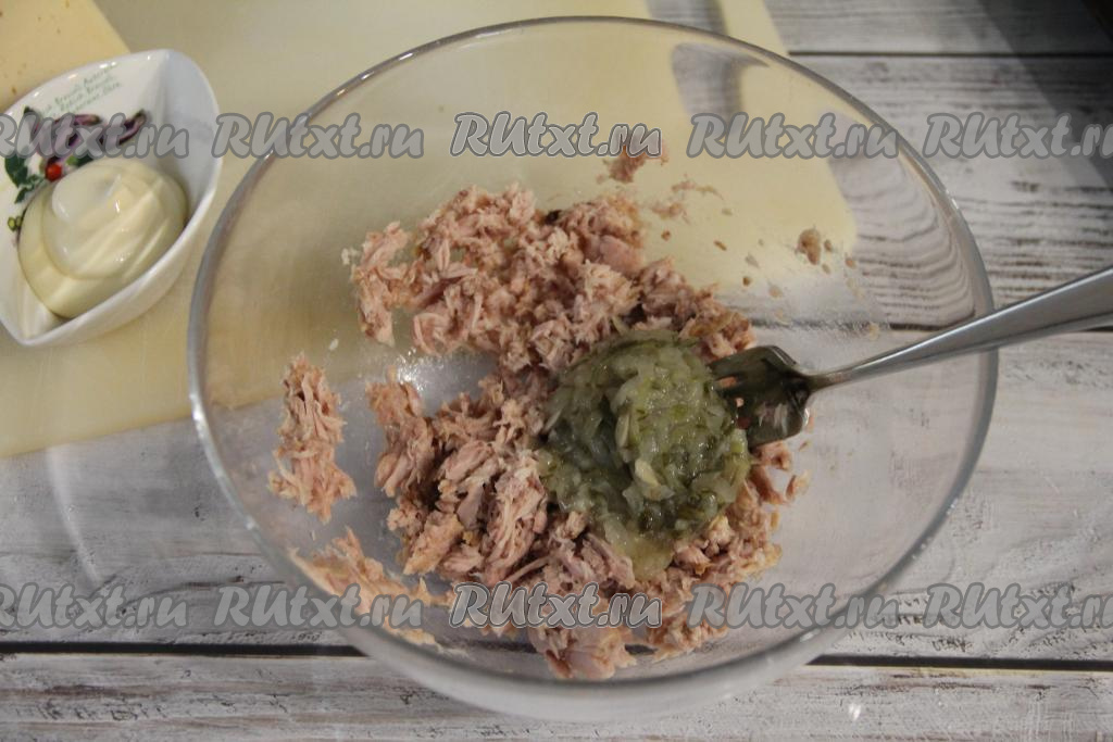 Открыть банку с консервированным тунцом, слить лишнюю жидкость, рыбку переложить в миску. Размять тунца в миске вилкой. В отдельную ёмкость натереть маринованный огурец на мелкой тёрке, затем отжать с него лишний сок. Огурец, отжатый от лишней жидкости, добавить в миску с размятым тунцом.