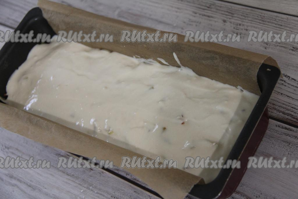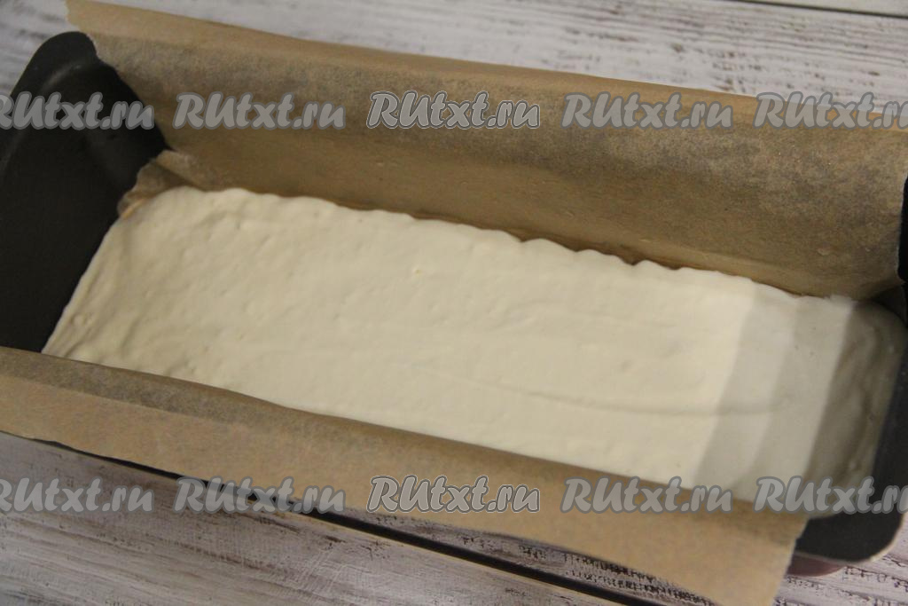 Форму для выпечки (я взяла прямоугольную форму размером 11 сантиметров на 30 сантиметров) выстелить пергаментом и слегка смазать растительным маслом. Влить в форму половину теста.
