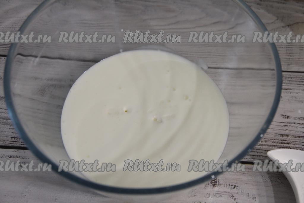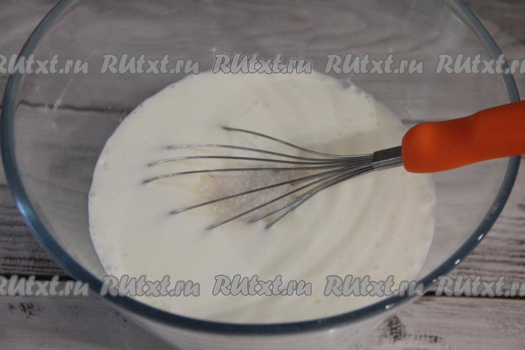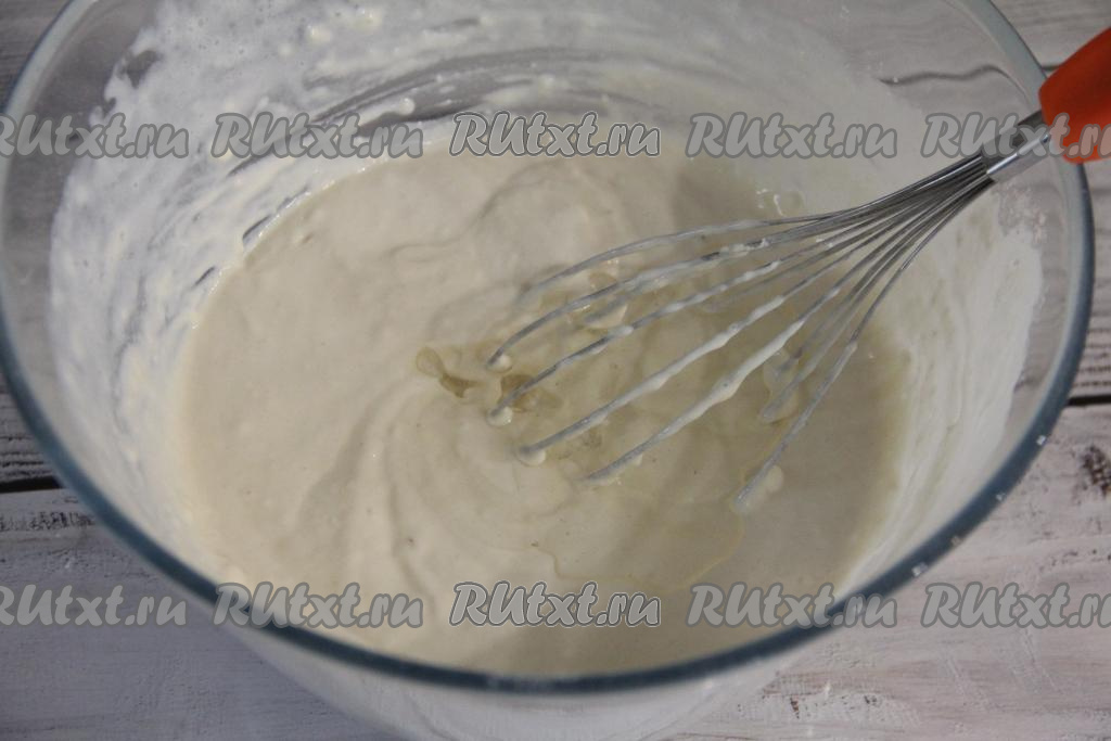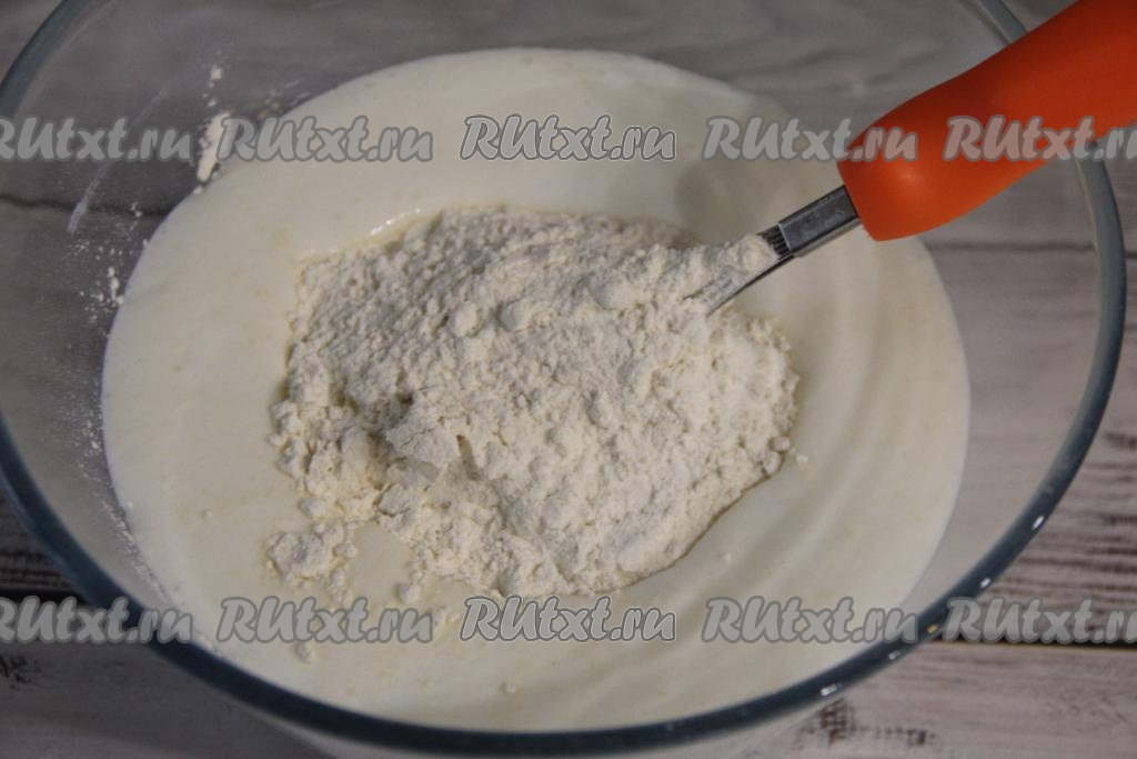 Затем начать в миску с кефирной смесью добавлять частями просеянную муку, каждый раз очень хорошо перемешивая тесто венчиком.