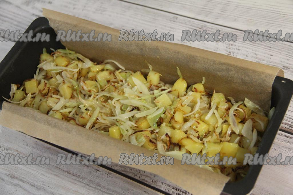 Равномерно выложить остывшую начинку из капусты и картошки поверх теста.