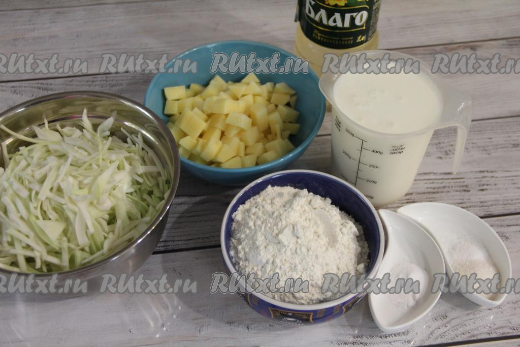 Подготовить продукты. Кефир можно взять любой жирности. Капусту нарезать на тонкие полоски. Картошку почистить и нарезать на кубики размером 1 сантиметр на 1 сантиметр.