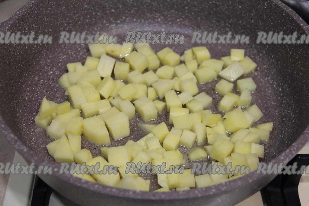 Для начала приготовим начинку, для этого в сковороду нужно влить растительное масло, разогреть его, выложить картошку. Обжарить кусочки картофеля в течение 5 минут, периодически переворачивая, на среднем огне.