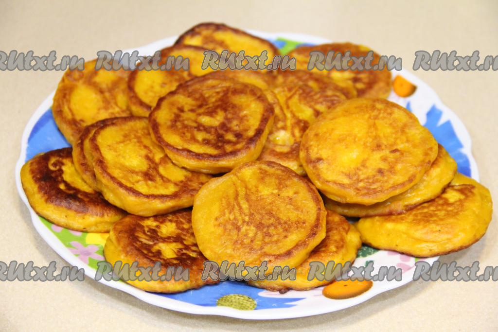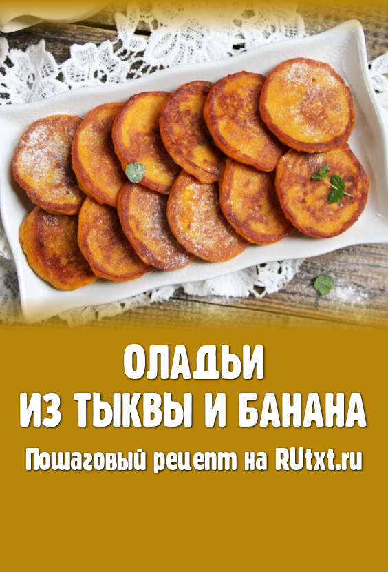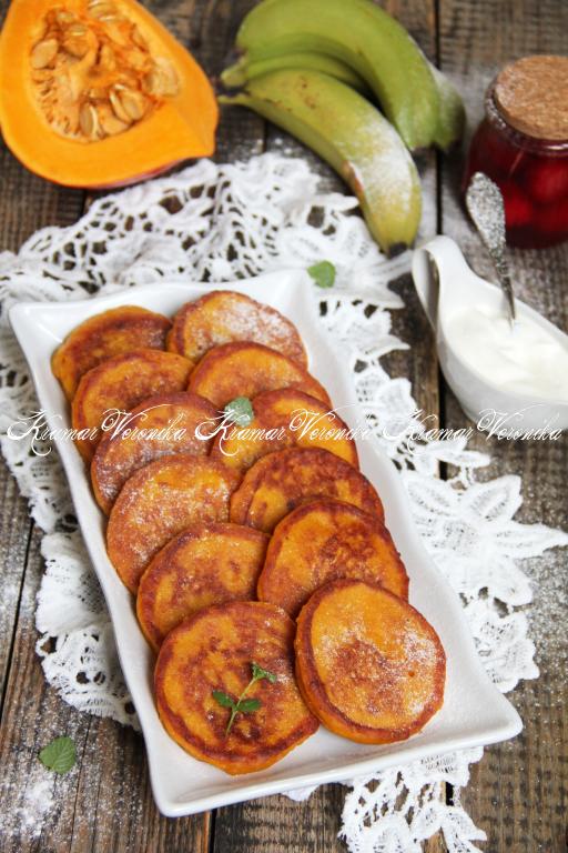 Вкусные, нежные оладьи, приготовленные из тыквы и банана, подать к столу, дополнив, по желанию, сметаной или вареньем.
