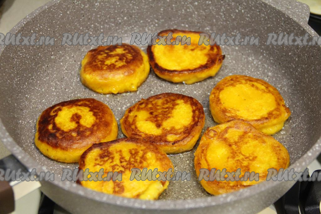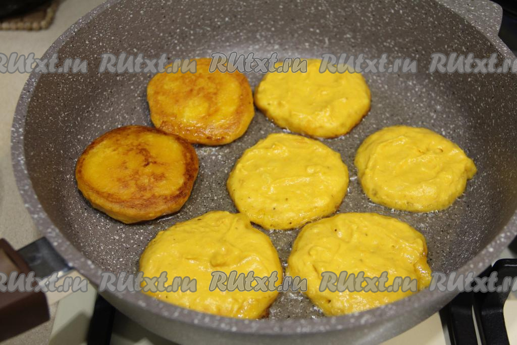 Выпекать оладьи из тыквы и банана до подрумянивания с двух сторон, затем переложить на тарелку.