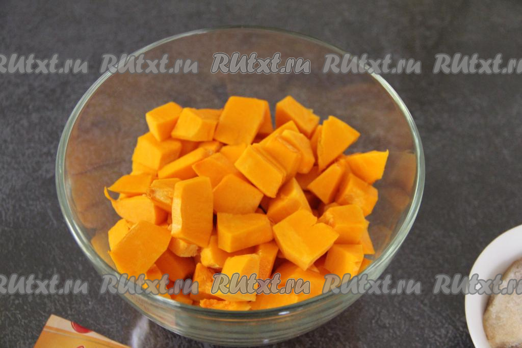 500 грамм тыквы, очищенной от волокон с семенами и от кожуры, нарезать на небольшие кубики (ориентировочно размером 1,5 на 1,5 сантиметра). Выложить кубики тыквы в миску, в которой можно готовить в микроволновке, и отправить в микроволновку. Запекать тыкву при максимальной мощности микроволновки (я запекала при мощности 850 Ватт) минут 8.