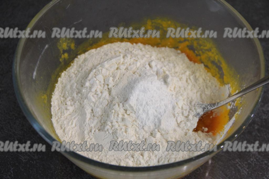 В получившееся тыквенно-банановое пюре всыпать муку, соль и разрыхлитель.