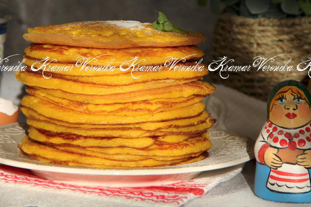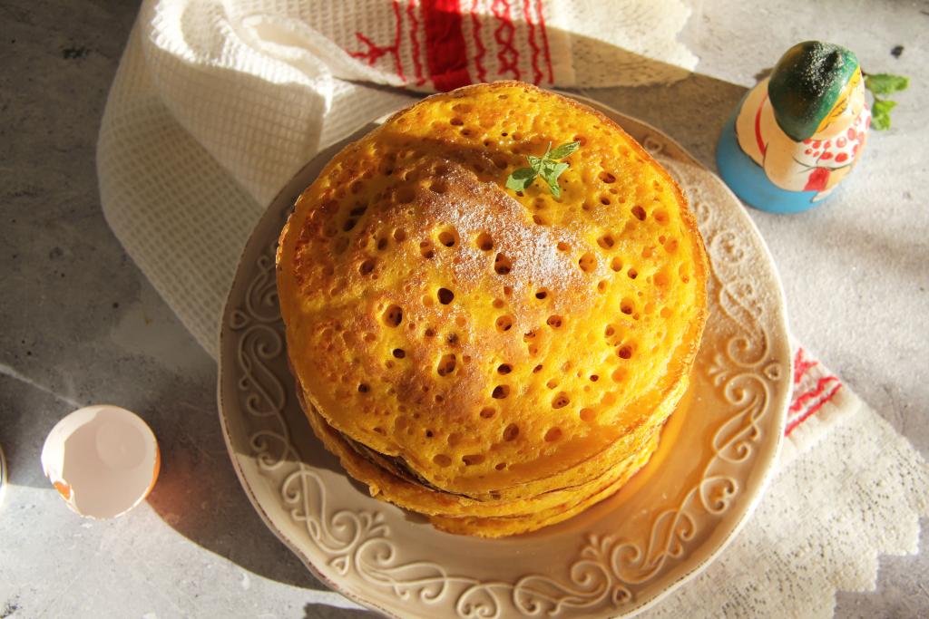Блины, приготовленные из тыквы на дрожжах, получаются яркими, пышными, с аппетитными дырочками, к столу подаём их со сметаной, мёдом или вареньем.