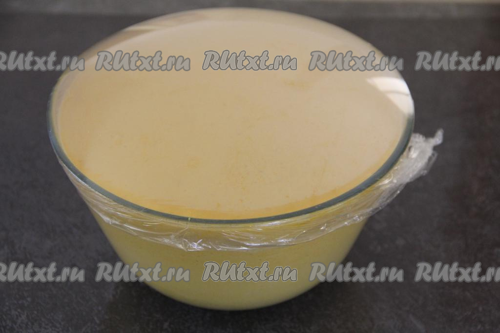Накрыть миску плёнкой и оставить на 1 час в тёплом месте. По прошествии часа тесто увеличится в объёме.