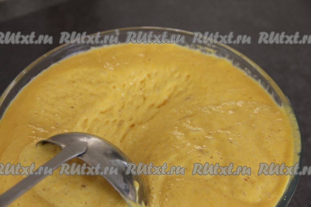 Оставшуюся тыкву пробить погружным блендером до получения пюре, переложить в глубокую миску, добавить запенившуюся дрожжевую смесь.