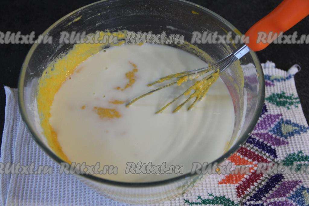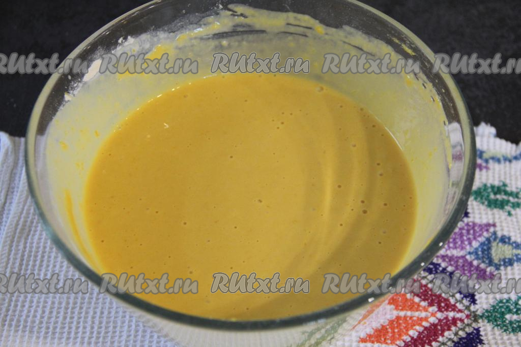 Влить растительное масло и хорошо перемешать блинное тесто венчиком, оно получится негустым.