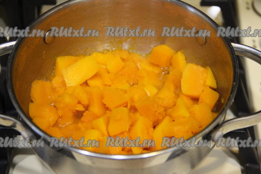 Поставить кастрюлю на огонь и тушить тыкву под крышкой минут 15 (до мягкости тыквы). Затем убрать с огня и дать остыть до комнатной температуры.