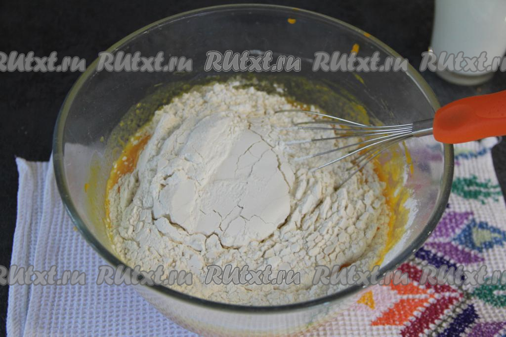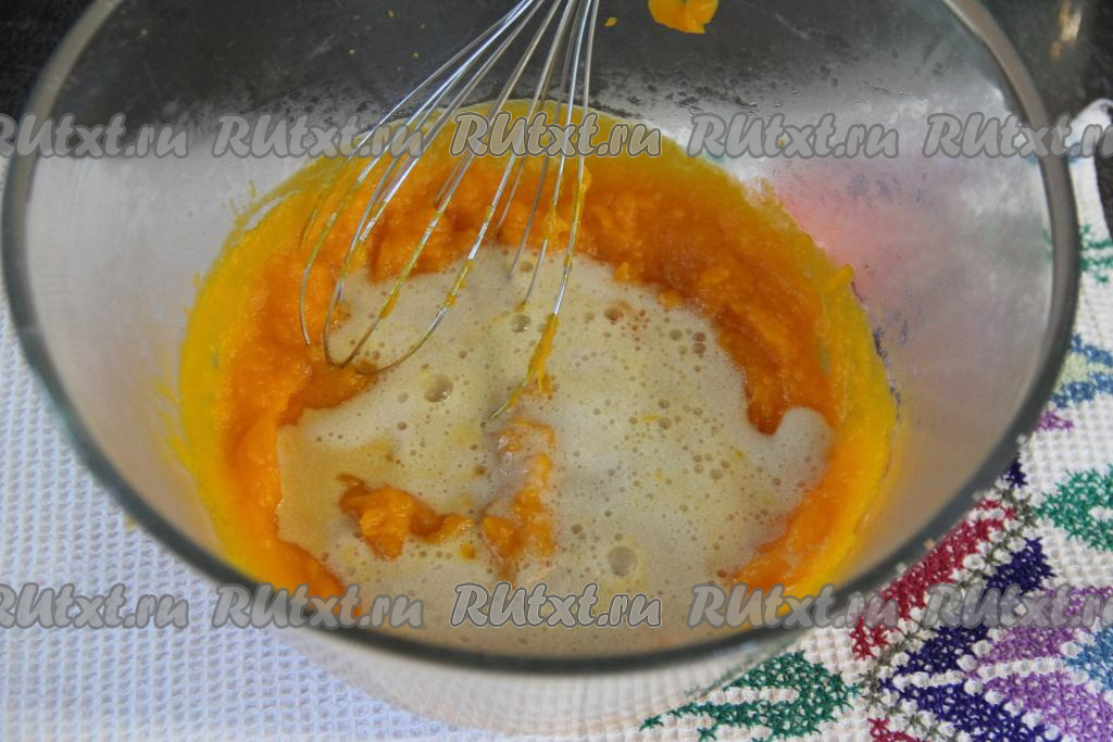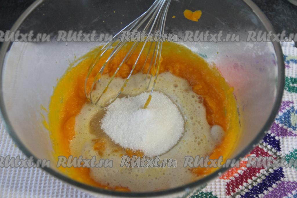 К тыкве и дрожжевой смеси всыпать соль и сахар, перемешать массу венчиком.