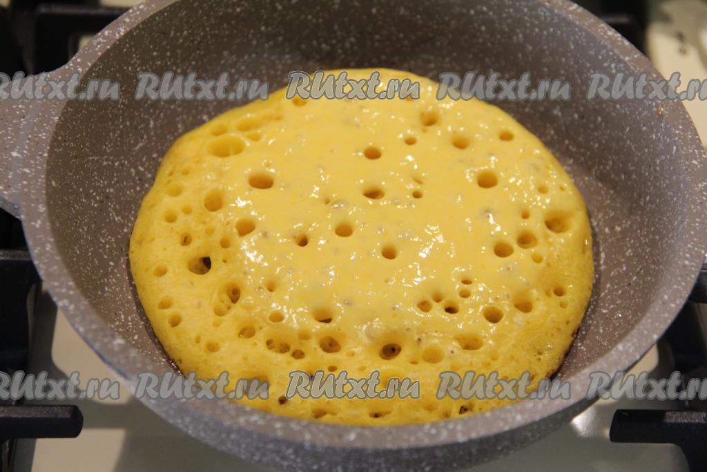 Должно получиться пузырчатое, воздушное тесто, как на фото. Аккуратно перемешать тесто половником, оно не осядет. В дальнейшем тесто перемешивать не нужно.