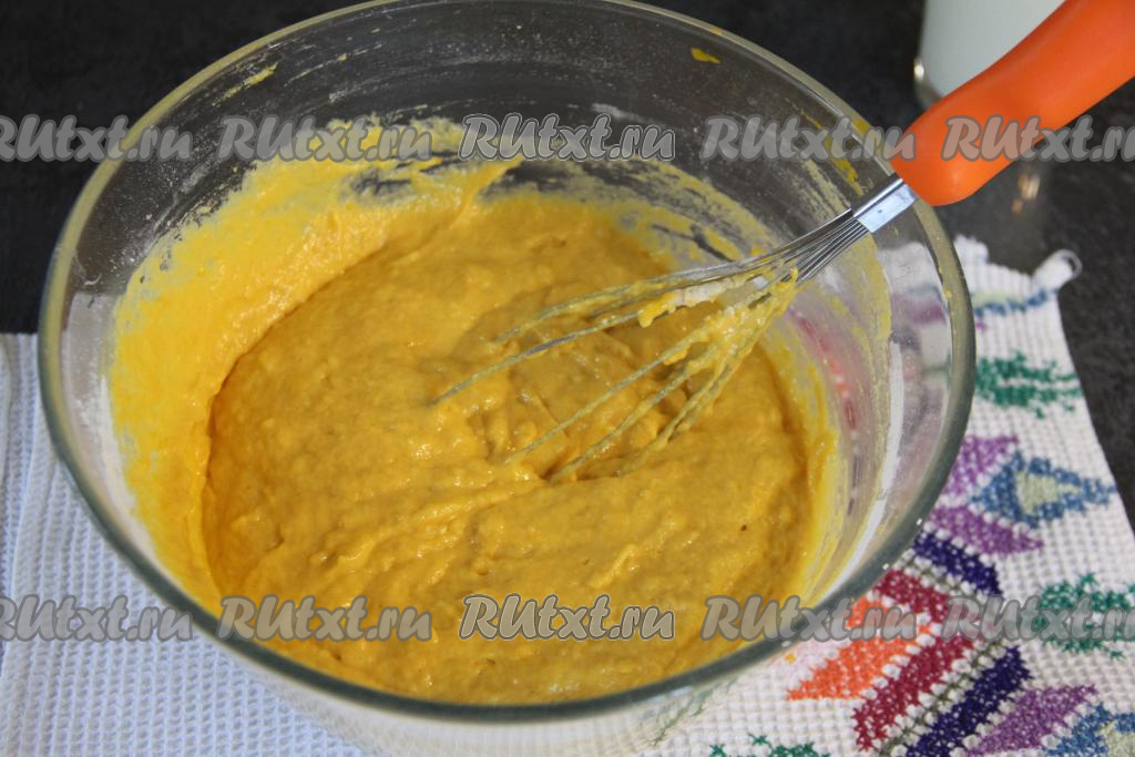 Перемешать тыквенное дрожжевое тесто венчиком, оно получится вязким и тягучим.
